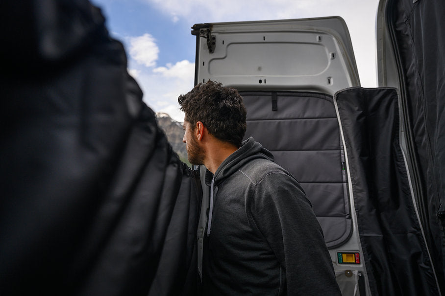 Effortlessly turn the back of your van into a showering area or changing room with our versatile privacy curtain. Crafted out of 100% recycled PET plastic bottles, our waterproof curtain quickly attaches to the rear doors of your van using extra strong rare earth magnets. Cover the gap between your doors and van using the included magnetic privacy screens. Adjust screen into place using tension cinch and, voila!