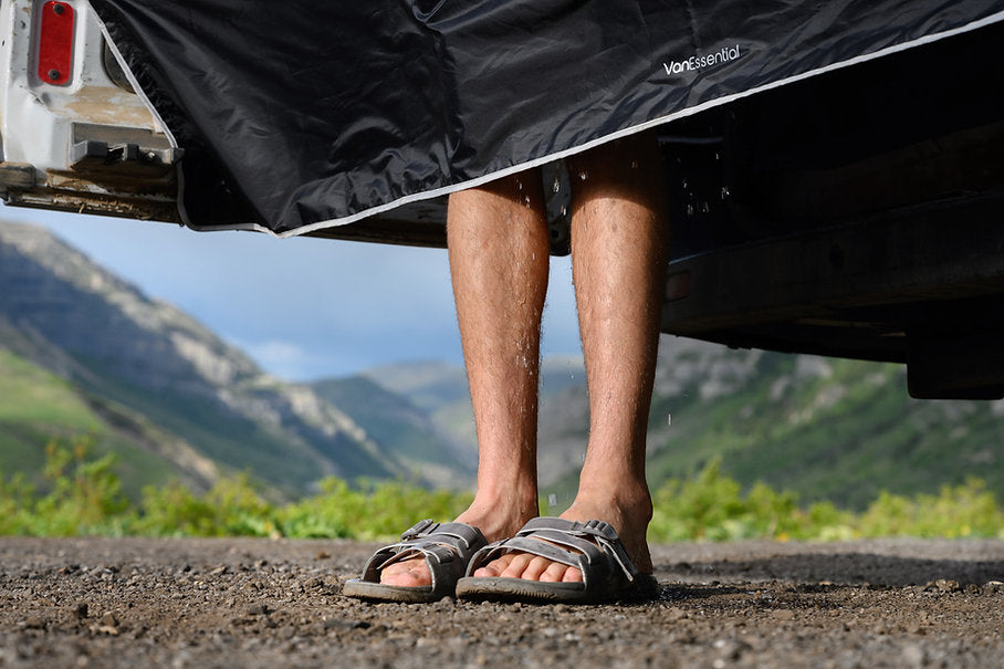 Attach shower screen to van with magnets and cinch in place. Place privacy panels between gap on rear door and van. Sets up in minutes!